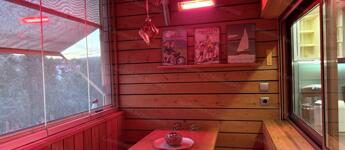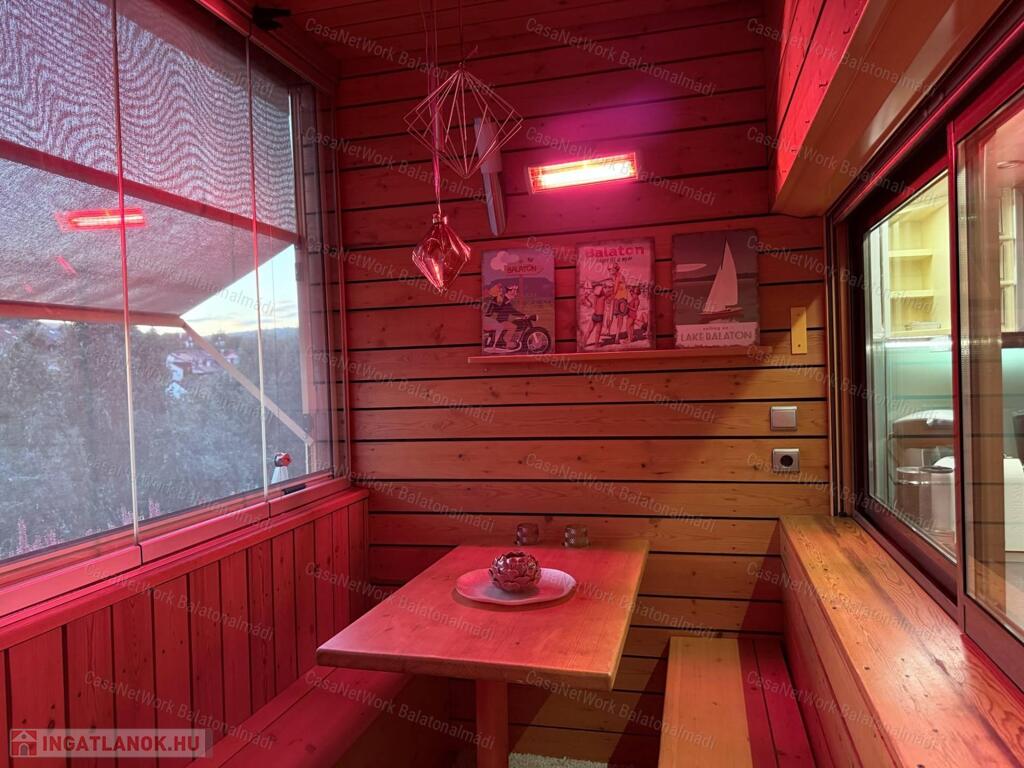 mozgatható szúnyoghálóval és WAREMA motoros ablaknapellenzővel van ellátva. Az 1m3 fából kialakított minden oldalon burkolt térben, felhajtható padok, asztal, grillsütő, infra-quartz hősugárzó biztosítja a komfortos használatot az év minden napján