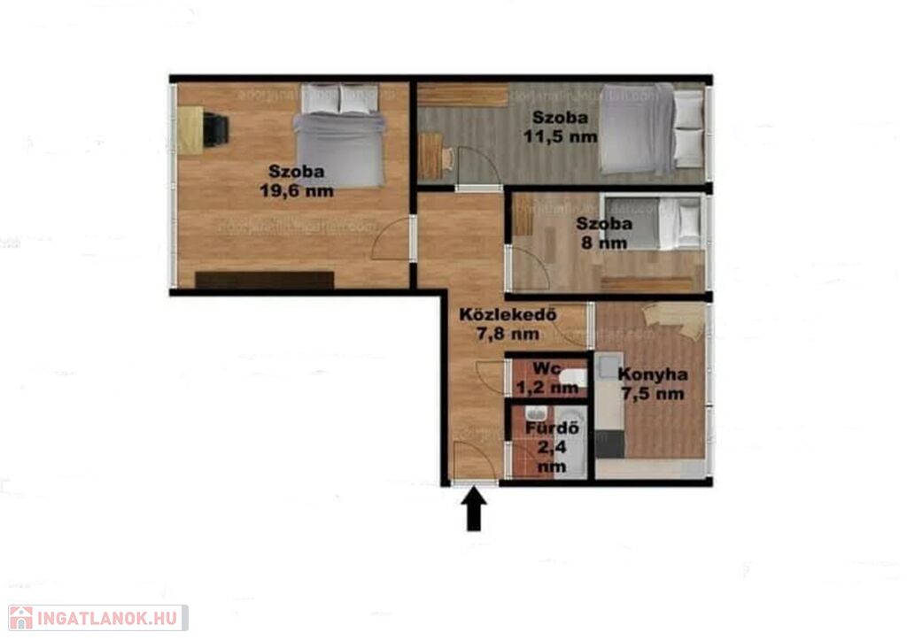 Helyiségei: 1 szoba, 2 félszoba, konyha, közlekedő, fürdőszoba, külön nyíló W.C., előszoba.