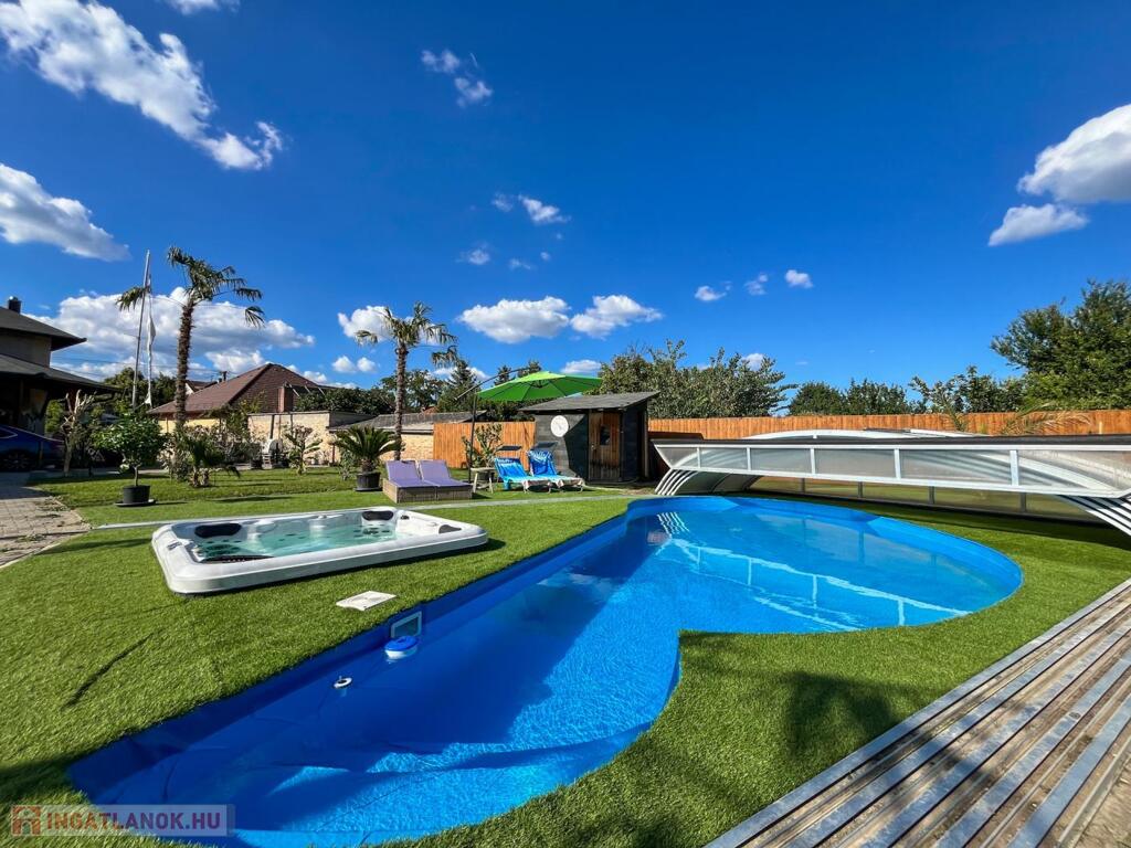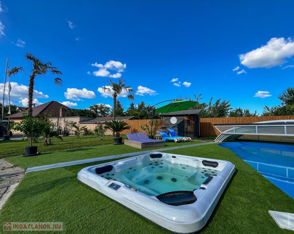 • 110 cm mély, eltolható tetejű, fűthető medence – tökéletes gyerekeknek, felnőtteknek