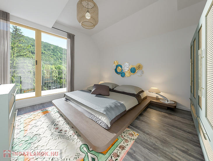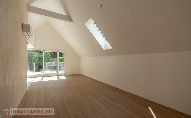 Az eladásra kínált lakás a társasház legfelső lakása, mely amerikai konyhás nappaliból, 2 hálószobából, fürdőszobából és külön wcből áll. A hálószobákból nyílik egy 5nm-es erkély, illetve a nappaliból nyílik egy 16nm-es napfényes terasz. A lakás ugyan tetőtéri, de a tervezéskor gondoskodtak a jól bútorozhatóságról, ezért a térdfal 1,70cm.