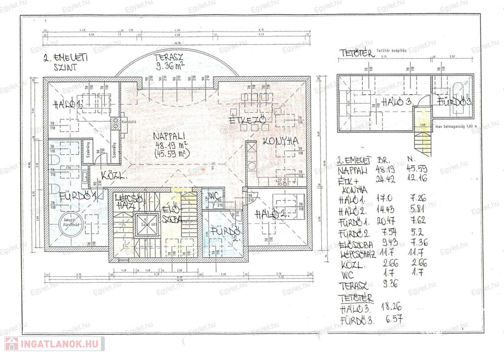 • Belső 2 szint, melyből a felső szint 27 m² -es szoba + fürdőszoba WC-vel