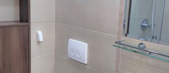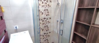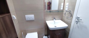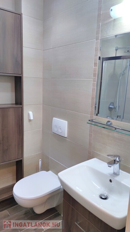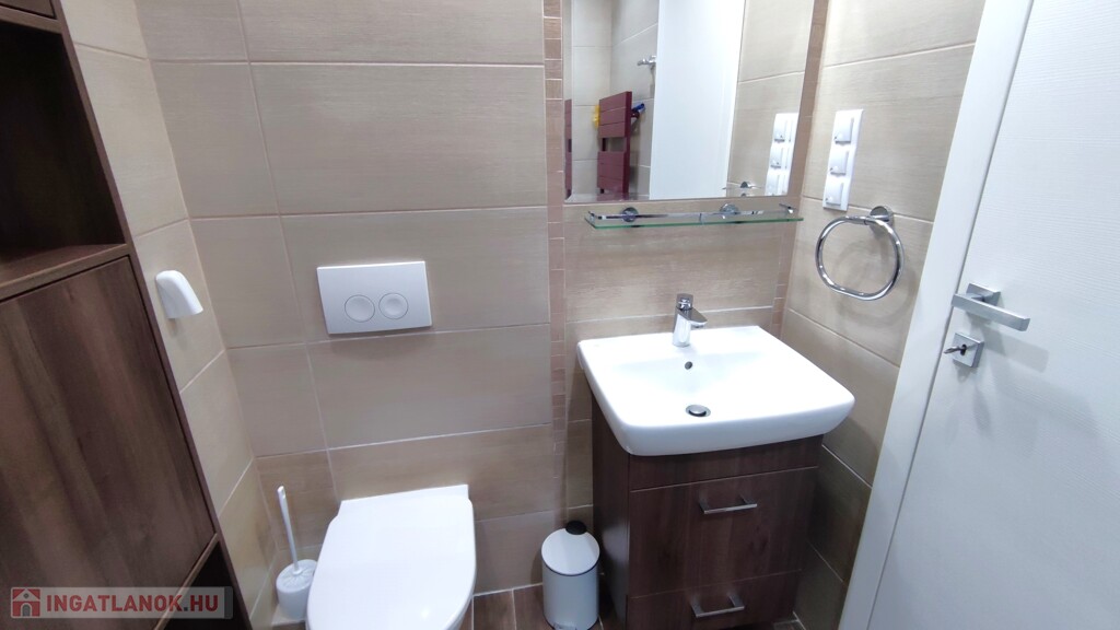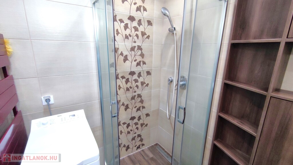 A fürdőszobában mosdó, zuhany, wc és mosógép található.