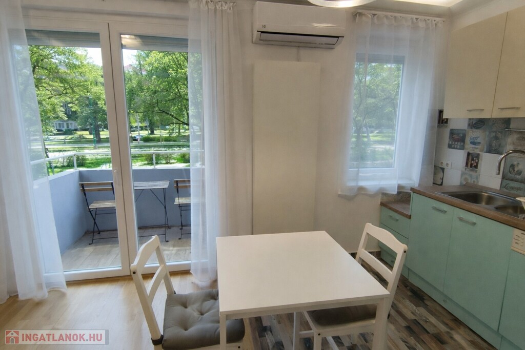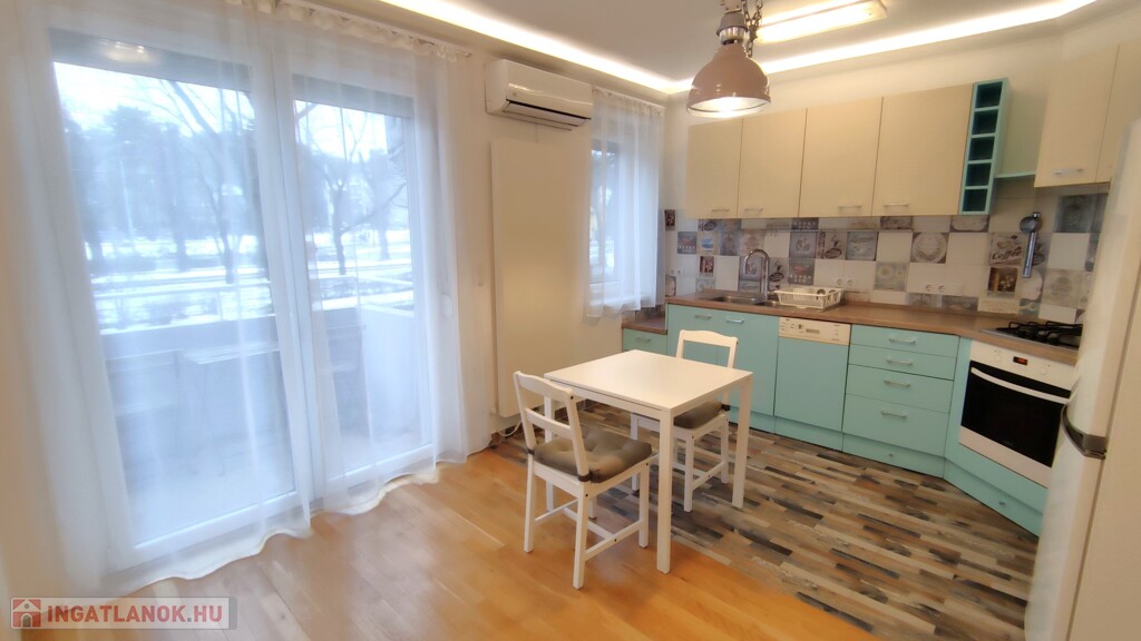 A lakás 2018-ban teljes felújításon esett át. Az amerikai konyhás nappali hatalmas ablakain árad be a napfény, erkélyéről szép kilátás nyílik a zöld környezetre. Az új műanyag ablakok redőnnyel és szúnyoghálóval felszereltek. A hálószobában franciaágy és beépített szekrény használható.