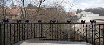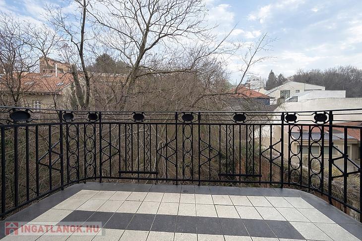 A nappaliból nyílik az 5 m²-es erkély, ahonnan a belső udvar zöld, fákkal sűrűn benőtt, szinte erdőszerű látványa tárul elénk, amely a városi környezetben ritka nyugalmat biztosít. A látvány inkább parkos, természetközeli érzetet kelt, mintsem klasszikus belső udvarét.
