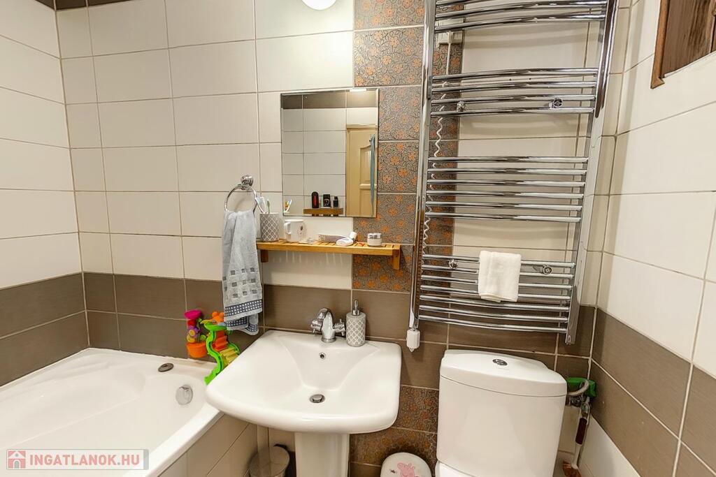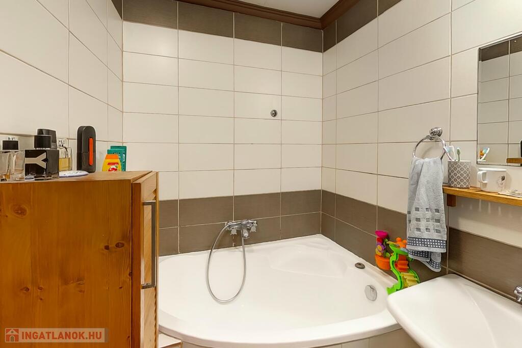 A közelmúltban felújítása megtörtént ami a vezetékek cseréjét is magába foglalta. A fürdőszoba tágas, modern burkolatokkal, szaniterekkel felszerelve.