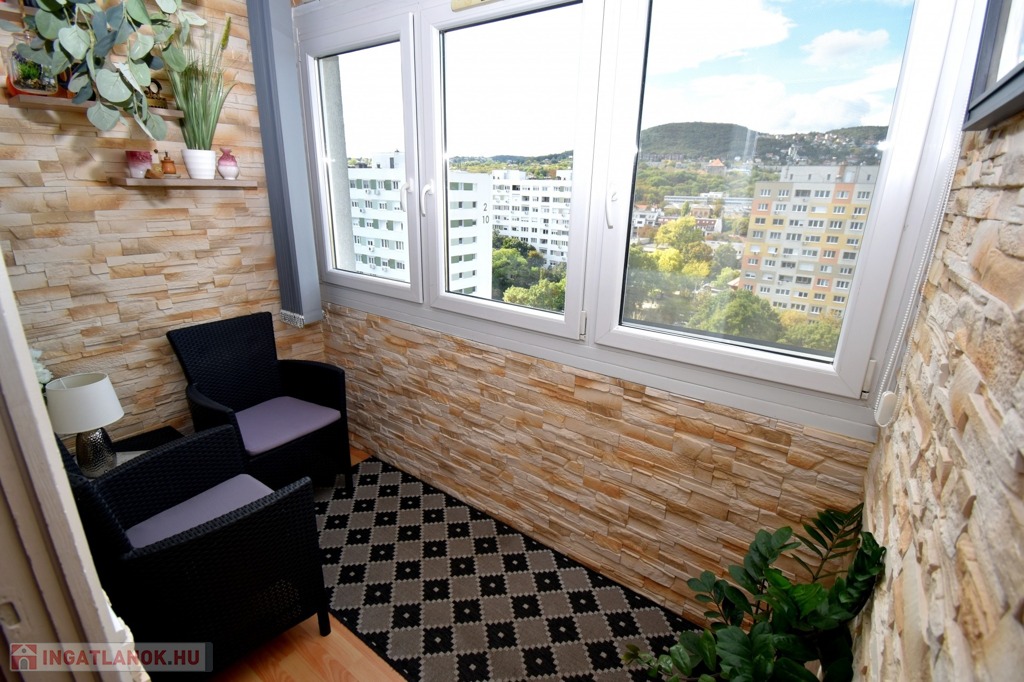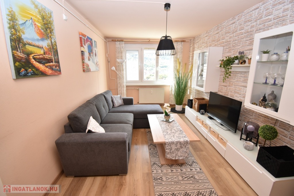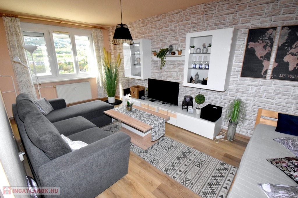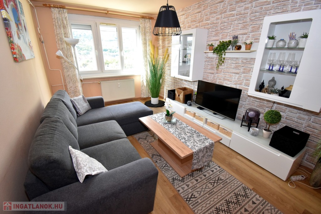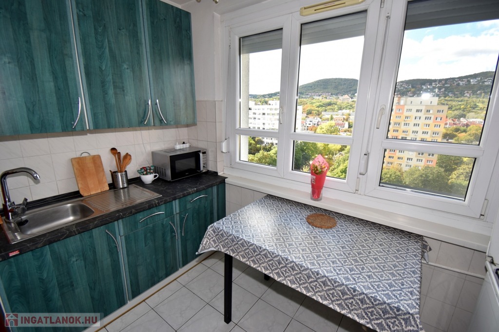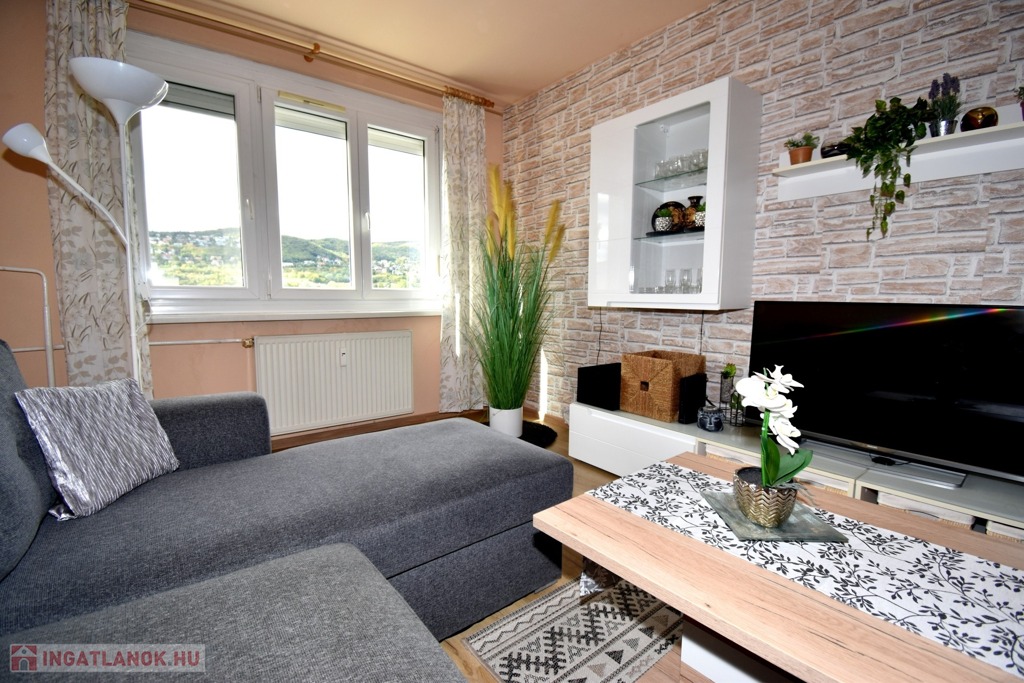 A két különnyíló szoba (12 és 17 m²) laminált parkettával burkolt, a többi helyiség járólapos. A fürdőszoba kádas, a WC külön helyiségben kapott helyet. A világos, nagy ablakos konyhából és az étkezőasztaltól is csodás kilátás nyílik a hegyekre.
