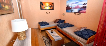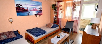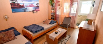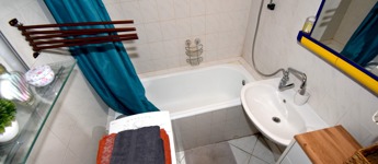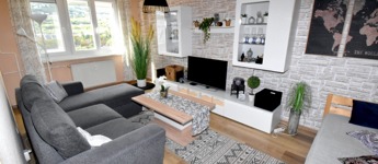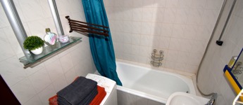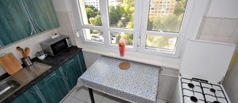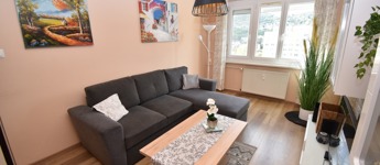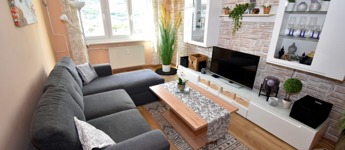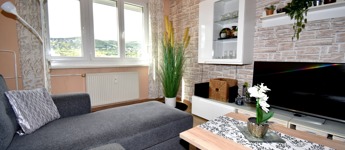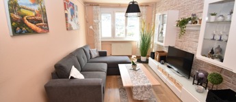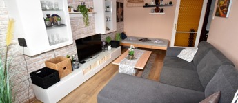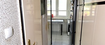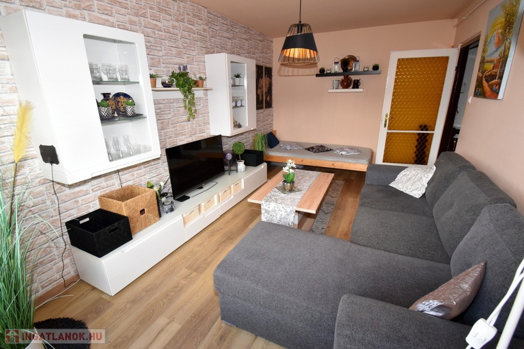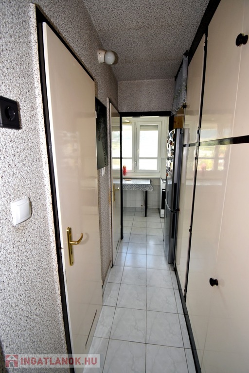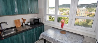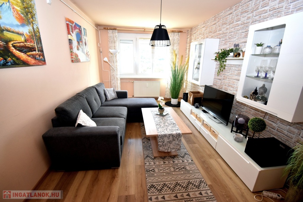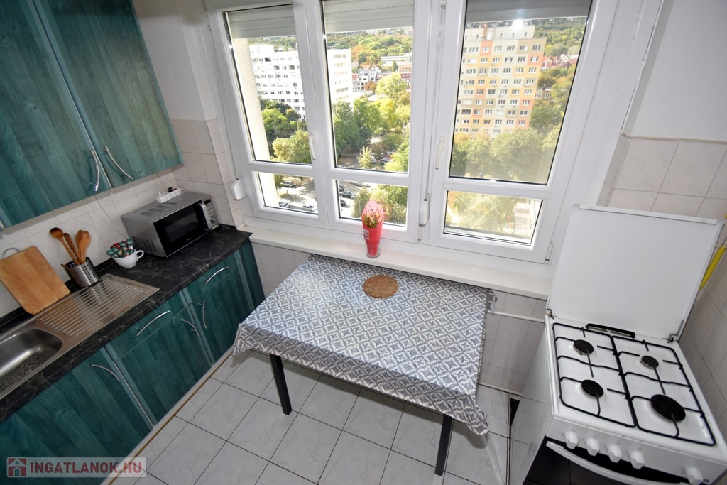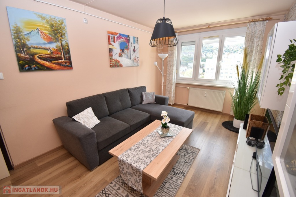 A két különnyíló szoba (12 és 17 m²) laminált parkettával burkolt, a többi helyiség járólapos. A fürdőszoba kádas, a WC külön helyiségben kapott helyet. A világos, nagy ablakos konyhából és az étkezőasztaltól is csodás kilátás nyílik a hegyekre.