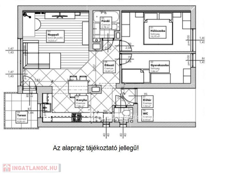 Az elrendezése nagyon jó, nappali, 2 hálószoba, étkező-konyha, egy kádas fürdőszoba és egy külön wc található benne.