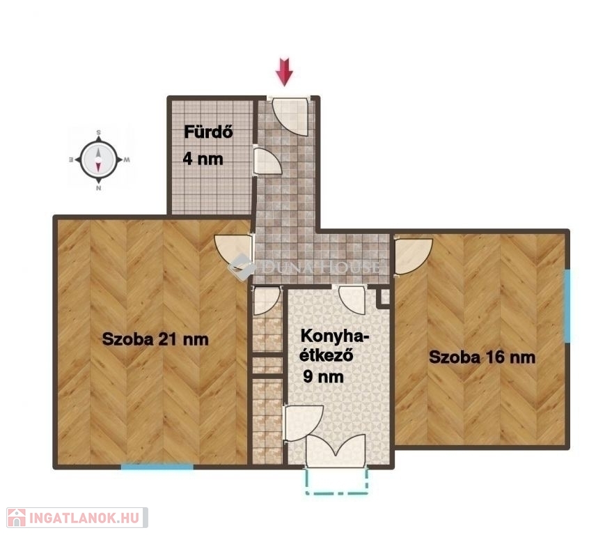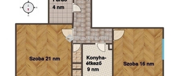 - a szobákban parketta, a konyhában linóleum, a többi helyiség járólapos