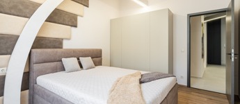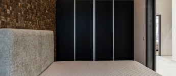 Design elemek: lebegő hatású mennyezeti gerendák, kókuszdizájn fal, kárpitozott és festett felületek (Oikos), rejtett pántos ajtók