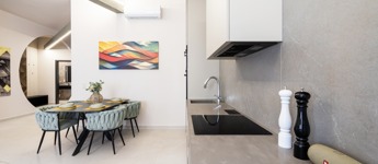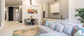 Modern open-plan layout: generous living and dining area with fully equipped kitchen