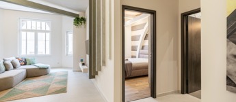 Recessed, pivot-hinge interior doors, new exterior doors and windows with electric shutters