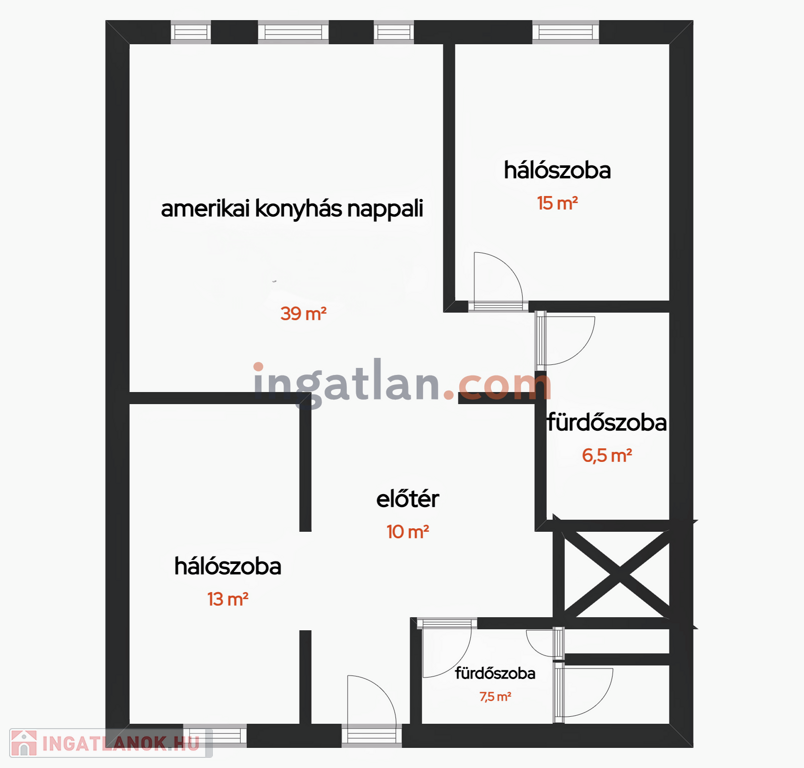2 külön nyíló hálószoba, 2 teljes értékű fürdőszoba (egyik zuhanyzós, másik kádas, mindkettőben WC)