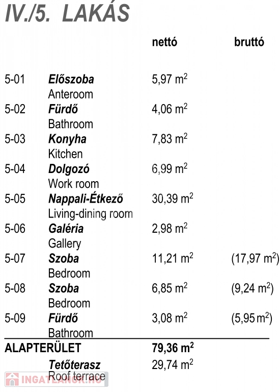 A 100m2-es értékesítési alapterület tartalmazza a nettó 79m2-es lakótéren felül 190cm alatti területek (12m2) és a terasz (30m2) területének 50%-át.