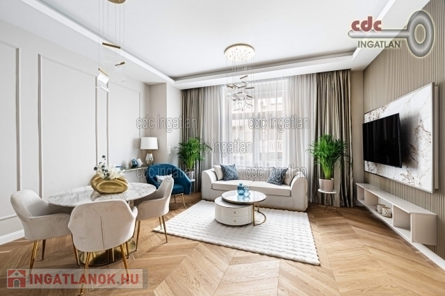 fő hálószobához egy elegáns káddal, WC-vel és bidével felszerelt fürdőszoba kapcsolódik, míg a második szobához egy modern zuhanyzós fürdő. Az ingatlan prémium minőségű bútorokkal és gépekkel együtt eladó, így az új tulajdonos azonnal beköltözhet egy teljesen felszerelt, exkluzív otthonba. A teljes körű felújítás során megtörtént a víz- és villanyvezetékek, valamint a fűtéscsövek, radiátorok cseréje. Designer csillárok, beépített szekrények, minőségi szaniterek és prémium burkolatok kerültek beszerelésre. A 3,30 méteres belmagasság és a chevron mintás tölgyfa parketta különleges, elegáns hangulatot kölcsönöz az otthonnak. A konyha teljesen gépesített, AEG márkájú készülékekkel felszerelt, mosogatógép, hűtő fagyasztóval, sütő, mikró, főzőlap, páraelszívó és mosógép is rendelkezésre áll. A lakás kényelmét két légkondicionáló és automata redőnyök, plusz sötétítők biztosítják. A fűtést házközponti rendszer biztosítja, a közös költség vízzel együtt 53.709.- Ft havonta. A társasház a klasszikus budapesti építészeti stílust képviseli. Az épület az 1900-as évek elején épült, és azóta számos felújításon esett át, megőrizve eredeti báját és eleganciáját. Az ingatlan, a lifttel felszerelt társasház 2. emeletén található a lépcsőházból nyílik a bejárati ajtó. A közvetlen közelben több busz- és villamosvonal elérhető, amelyek gyors és kényelmes kapcsolatot biztosítanak a város többi részével. Ez a lakás nem csak otthonként, hanem befektetésként is tökéletes választás azok számára, akik a belvárosi luxust és kényelmet keresik. Az ingatlan minden részlete a legmagasabb színvonalat