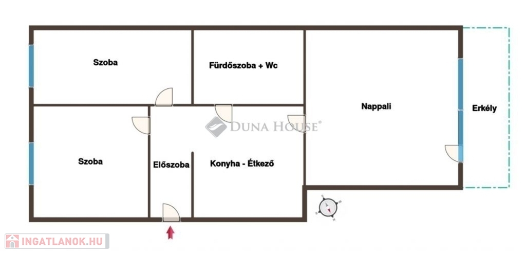 Az ingatlanban 3 különnyíló szoba, egy étkezős konyha, egy fürdőszoba+wc, és egy előszoba helyiségek találhatóak. Elrendezése kitűnő, a szobák mind külön bejáratúak, a tágas, 6m2-es erkély a legnagyobb szobából nyílik, utcai nézetű. A lakás méretéhez képest kifejezetten tágas fürdőszobával rendelkezik, melynek köszönhetően nagy méretű sarokkád is beszerelésre került.