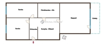 Az ingatlanban 3 különnyíló szoba, egy étkezős konyha, egy fürdőszoba+wc, és egy előszoba helyiségek találhatóak. Elrendezése kitűnő, a szobák mind külön bejáratúak, a tágas, 6m2-es erkély a legnagyobb szobából nyílik, utcai nézetű. A lakás méretéhez képest kifejezetten tágas fürdőszobával rendelkezik, melynek köszönhetően nagy méretű sarokkád is beszerelésre került.