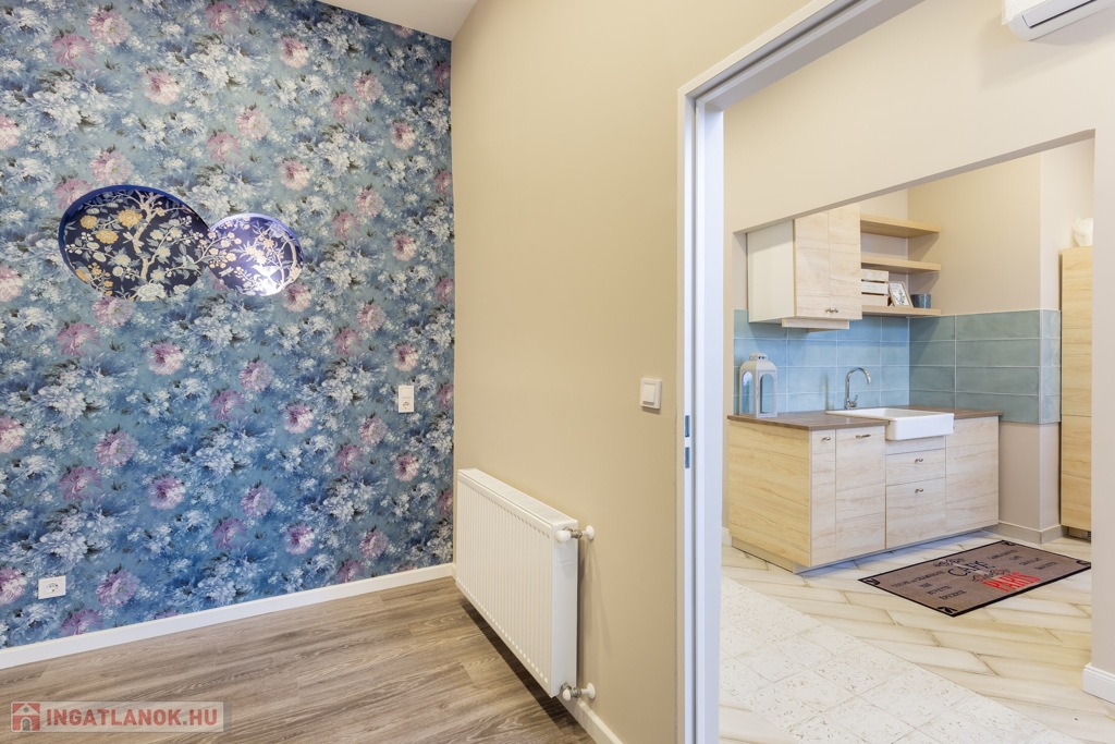 Jelenlegi kialakítás szerint, egy kis-szobányi gardrób áll rendelkezésre, vendégszobával, berendezett, igényes konyhával. A nagy ablakos fürdő szintén teljesen felújított, fa hatású csempével, és igényes zuhannyal van ellátva.