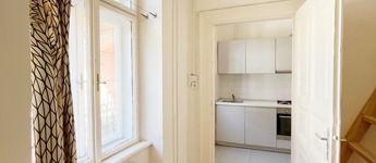 A nyílászárók eredeti fa szerkezetek, megőrizve a lakás nagypolgári hangulatát.