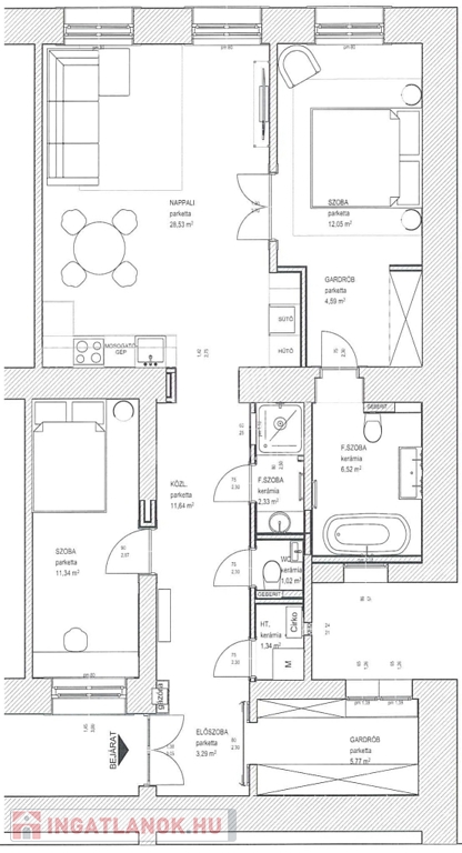 Az ingatlan a tulajdoni lapon 85 nm, a valóságban 88 nm-es tágas tereivel, két hálószobával, két fürdőszobával, amerikai konyhás nappalival és impozáns tükörfelületekkel hódít. A komfortot minden helyiségben klíma, valamint padlófűtés és kombi kazán garantálja.