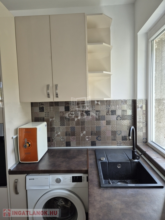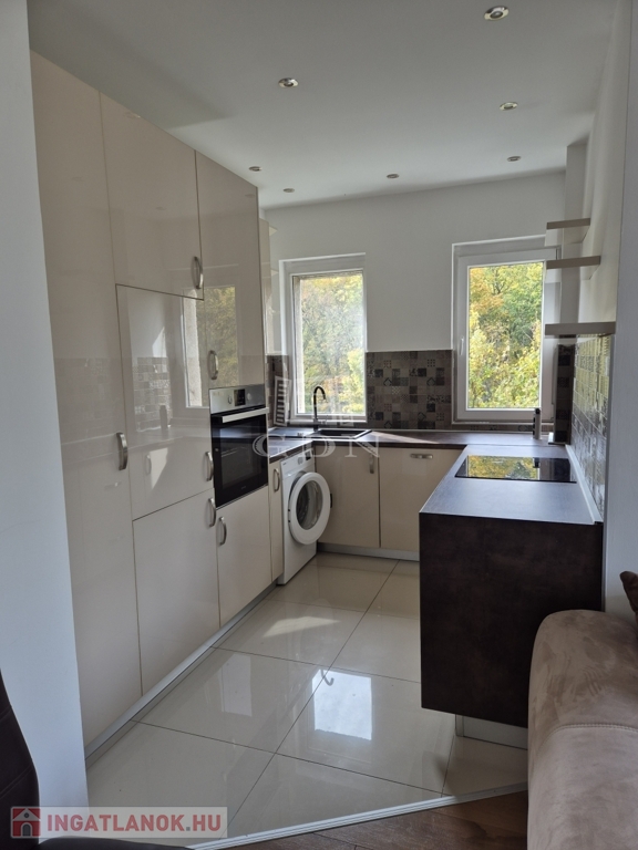 A konyha méretéhez képest rendkívül praktikus és jól felszerelt, teljes körűen gépesített (mosógép, mosogatógép, sütő, indukciós főzőlap, hűtőszekrény, fagyasztó).
