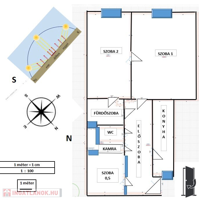 Az ingatlan a ház magasföldszintjén helyezkedik el, délnyugati fekvésének köszönhetően világos, napos.