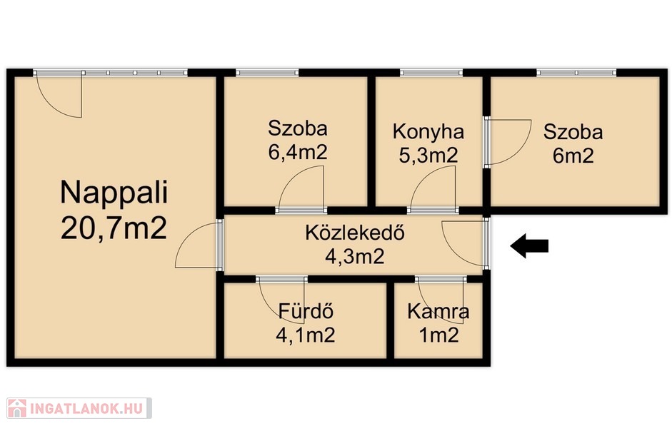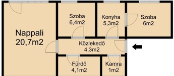 Elosztása kiváló: külön nappali és 2 kisebb hálószoba,fürdő, ablakos szeparált konyha, valamint egy tágas spejz is tartozik hozzá.