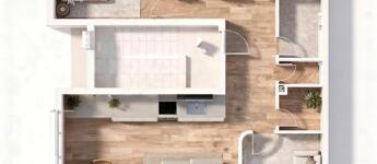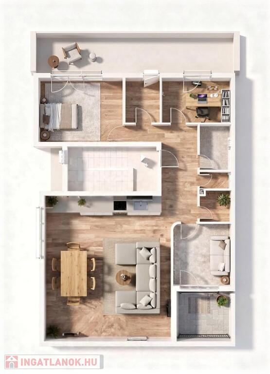 A lakásban egy 44 m2-es amerikai konyhás, étkezős nappali, 3 szoba, 2 fürdőszoba, előtér, közlekedő, mellékhelyiség és 2 terasz található (7 m2+ 23 m2). Gyönyörű, egyedi, minőségi burkolatok lettek beszerelve.
