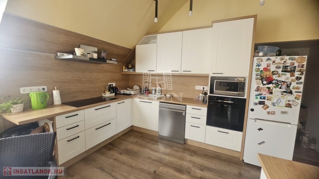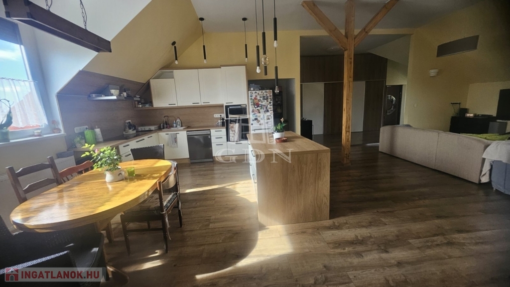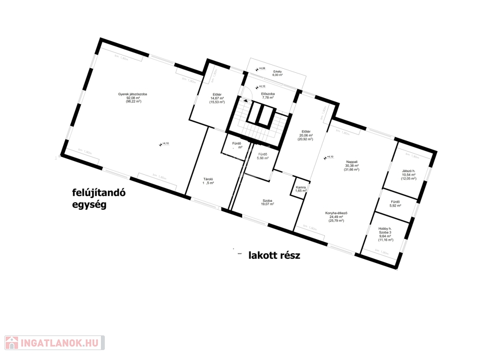 Az egyik 140nm-es lakresz 54nm-es amerikai konyhás nappaliból, nagy halóból tusolós fürdővel, 2 külön szoba, kádas fürdőszoba, 7nm erkély tartozik 20nm előtérből áll. +50nm pince is tartozik hozzá.