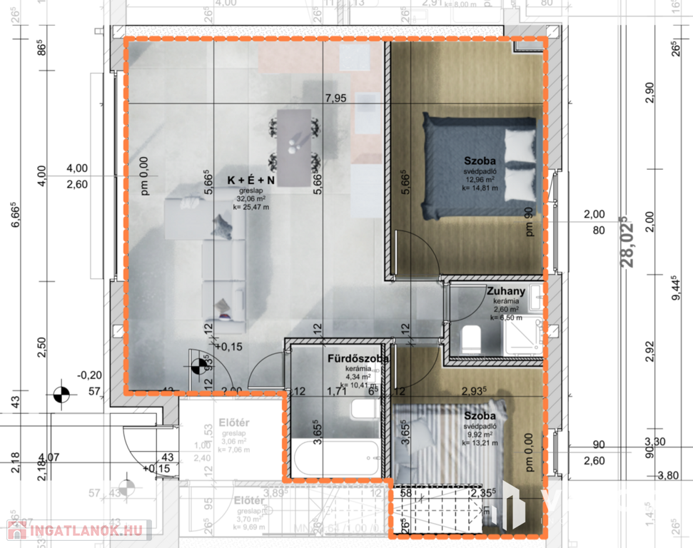 A jól átgondolt alaprajz, a világos amerikai konyhás nappali, a két külön nyíló hálószoba, valamint a két fürdő( tusoló vagy kád igény szerint választható és a gardrób minden élethelyzetben kényelmet biztosít.