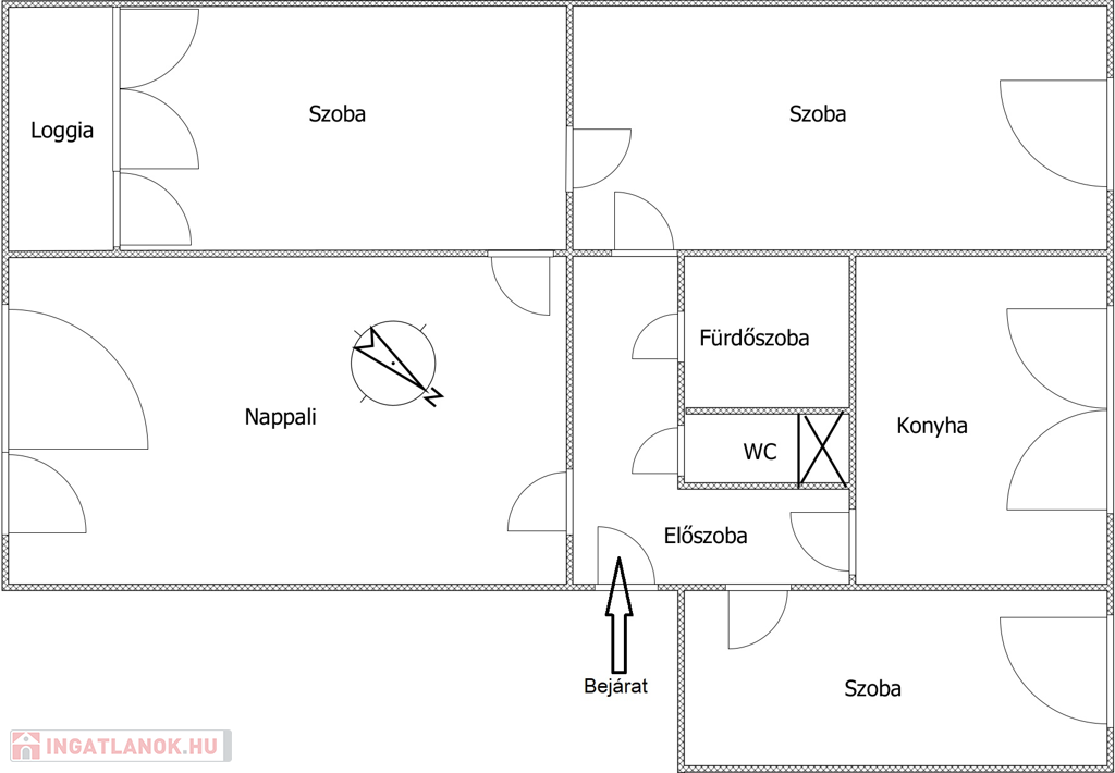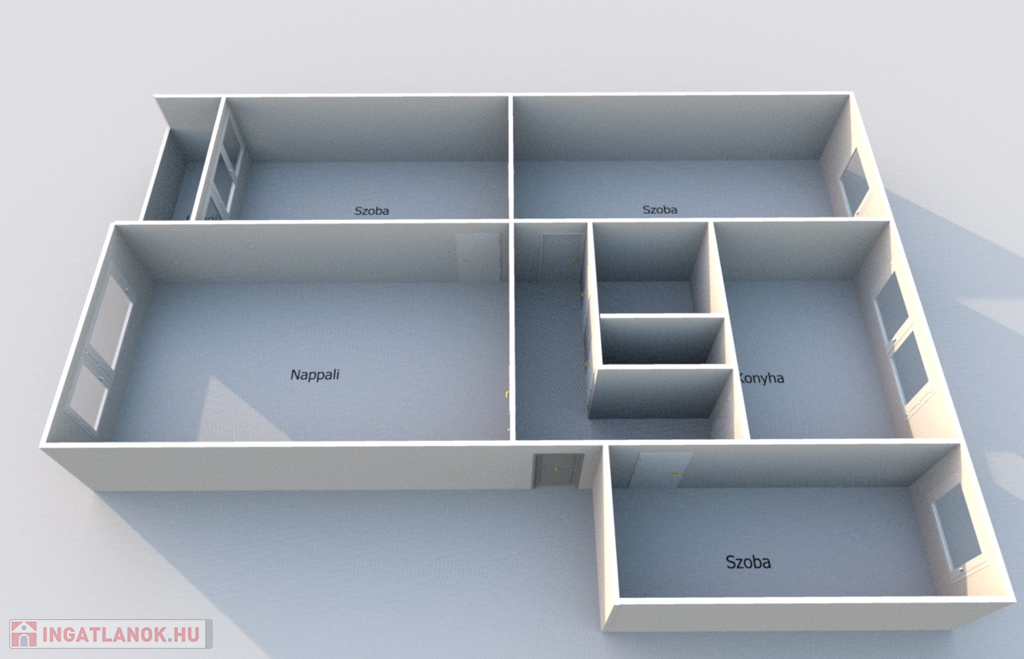 - Helyiségei: előszoba, közlekedő, nappali + 3 szoba, konyha, fürdőszoba, WC külön.