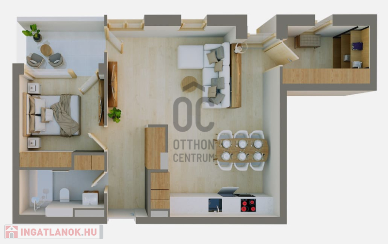 Ez az 1. emeleti lakás 58,57 nm-es, nappali-étkező-konyha +1 szobás, 4,58 nm-es loggiával.