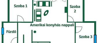 Az amerikai konyhás nappali mellett, előszobával, fürdőszobával külön WC-vel, és 3 hálószobával rendelkező lakás.