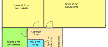 Helyiségei: 2 külön nyíló szoba, konyha, fürdőszoba, W.C., előszoba/közlekedő.