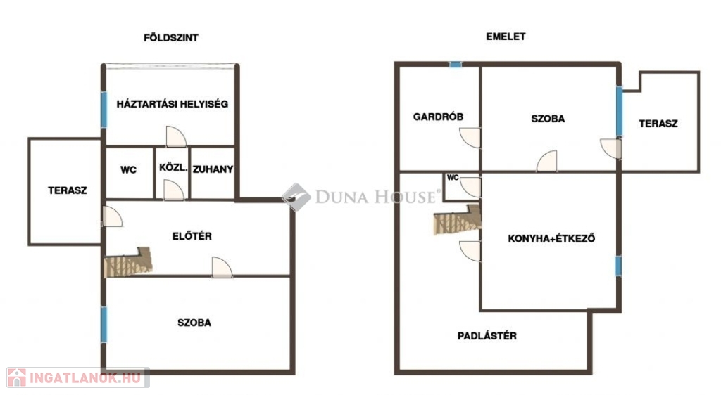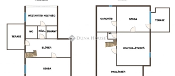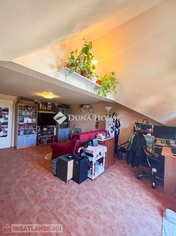 2. Emelet: tágas konyha-étkező, egy erkélyes nagy szoba gardróbbal, külön wc és nagyméretű padlástér.