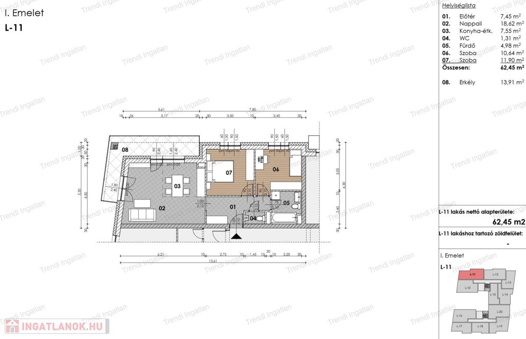 Az 1. emeleten található 62,45 m²-es lakásban amerikai konyhás nappali, 2 szoba, fürdőszoba, WC, közlekedő, előtér kerül kialakításra. Nappaliból 13,91 m²-es erkély nyílik.