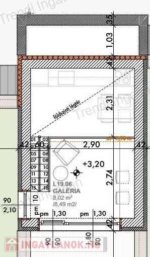A meghirdetett 1. emeleten található 50,31 nm-es lakásban az alsó szinten amerikai konyhás nappali, szoba, fürdőszoba és előtér található. Nappaliból 7,94 nm-es erkély nyílik. A nappaliból vezető lépcsőn keresztül érhető el a galéria, ami akár hálószobának is alkalmas.