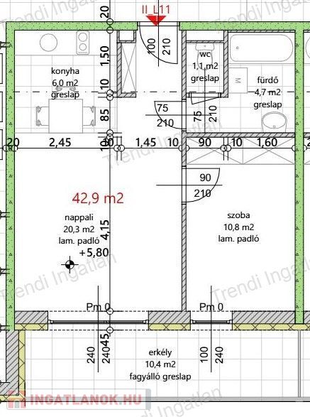 A meghirdetett 2. emeleten található 42,90 nm-es lakásban amerikai konyhás nappali, szoba, fürdőszoba, külön WC, előtér kerül kialakításra. Nappaliból 10,40 nm-es erkély nyílik.