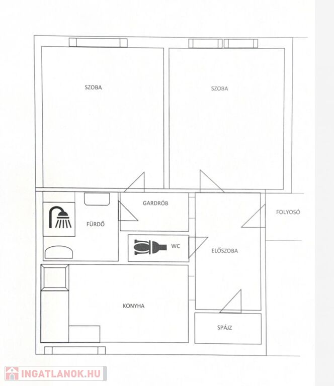 közlekedő (2,6m”), fürdőszoba zuhanyzóval (3,92m2), 2 szoba (16,4m2, 15m2)