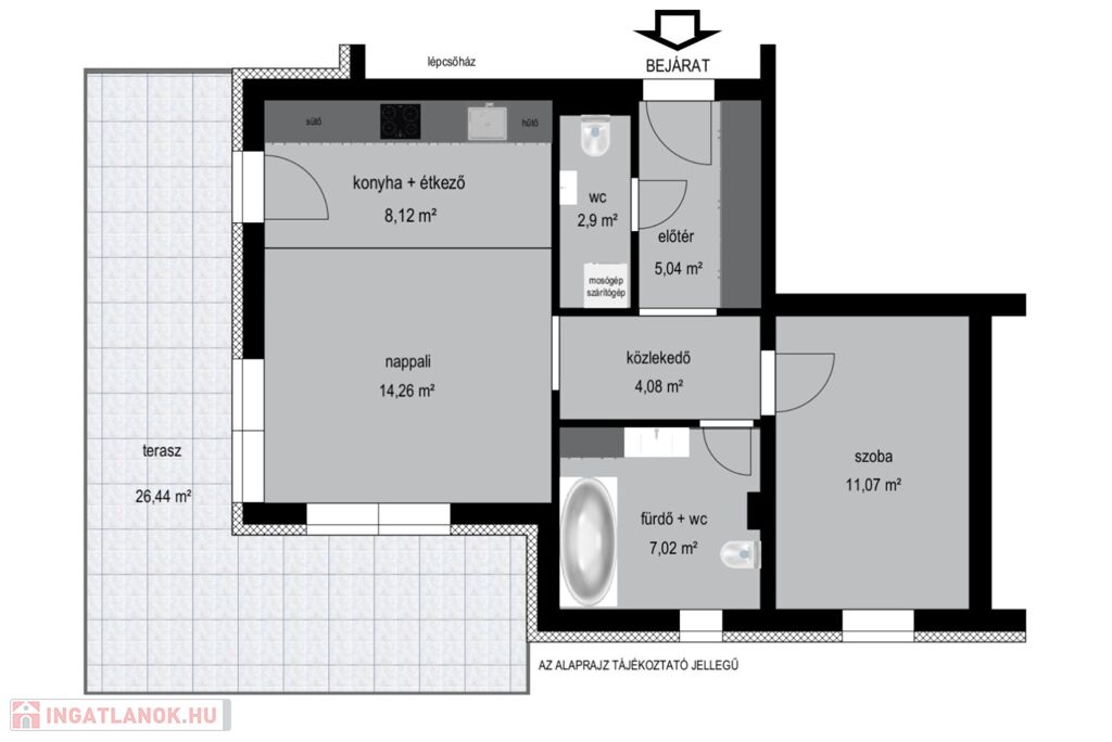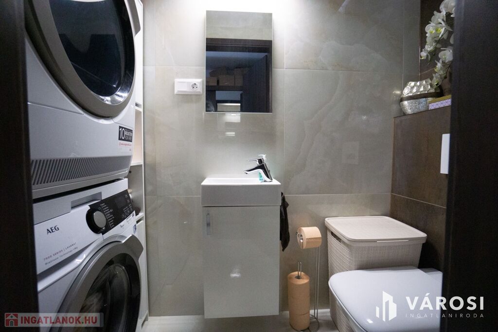 Elrendezése alapján: világos nappali-konyha-étkező, tágas hálószoba, előszoba, kádas fürdőszoba , valamint egy külön WC elosztású, ez utóbbi helyiségben kapott helyet a mosógép és szárítógép is.