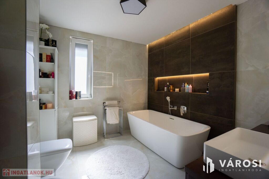 Az esztétikumot tovább növeli a terek dekorvilágítása, a hálószoba stílusos fali burkolata.