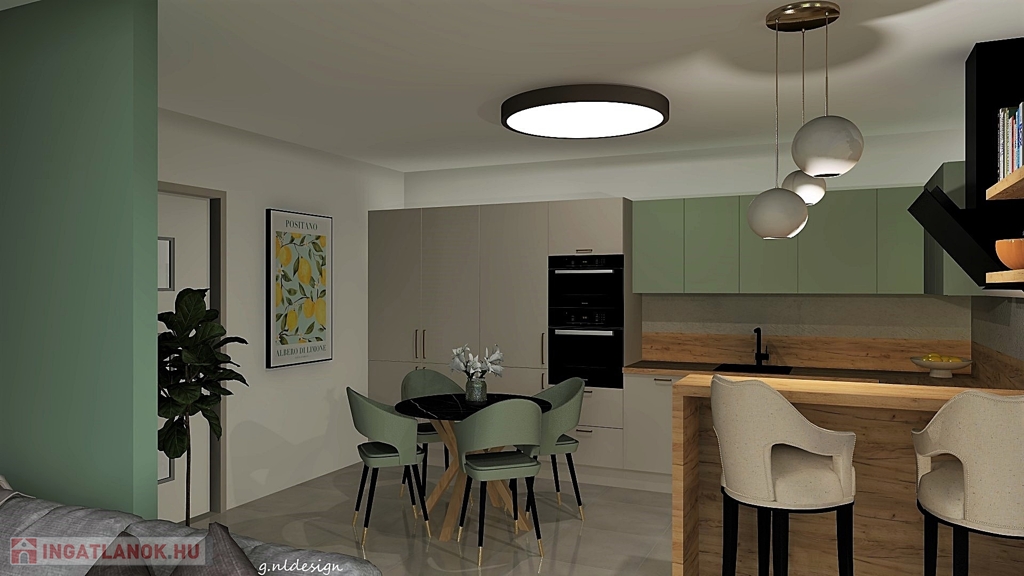 A lakás alapterülete összesen 55,93 m2, amelyhez egy 9,33 m2-es terasz tartozik. A lakáshoz tartozik még egy térkövezett, zárt udvari kocsibeálló is. A lakás helyiségei: hatalmas étkező-konyha, nappali, 1 hálószoba, fürdő, WC kézmosóval, előszoba.