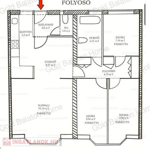 Lakás helyiségei: szélfogó, nappali, három szoba, konyha, étkező, közlekedő, fürdőszoba, külön WC.
