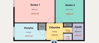 - Szobák: 2 db (22,42 és 15,58 m2)