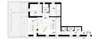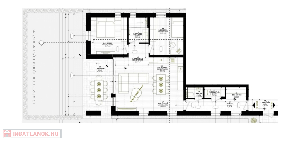 Az L alakú épület egy védett közösségi teret ölel körül, ahol egy közös park kerül kialakításra.