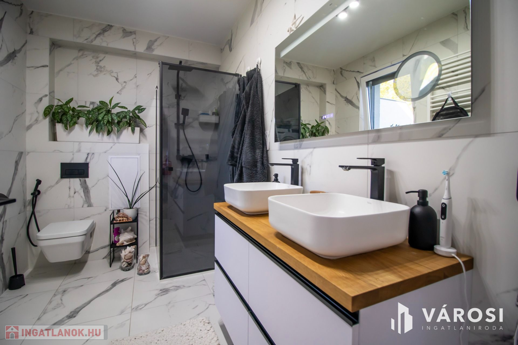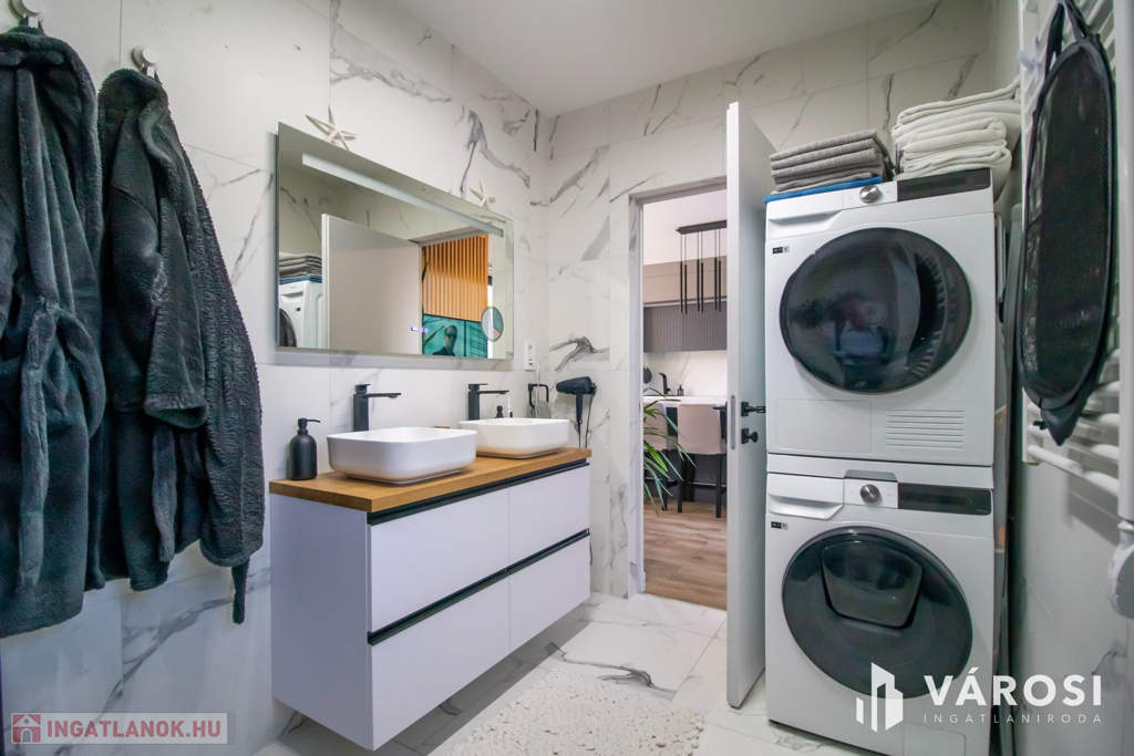 A fürdőszoba, a luxust jelképező márványmintás burkolatával és egyedi megoldásaival vonja magára a figyelmet. A mosó és a szárítógép is tartozéka a lakásnak.