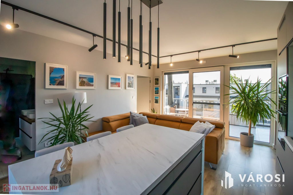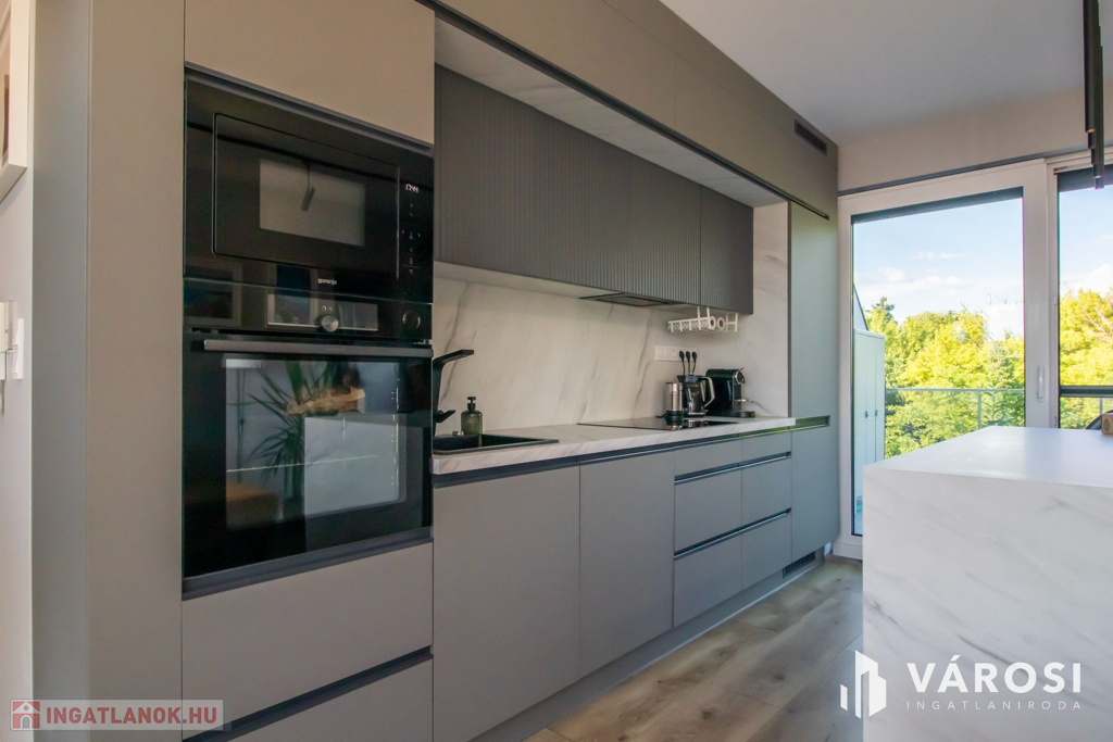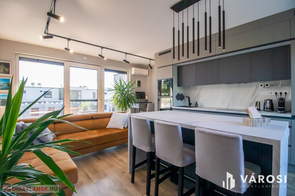 A konyhabútor is méretre készült és a legkorszerűbb gépekkel van felszerelve, amik természetesen itt maradnak szintén. A nappaliban igényes ülőgarnitúra csábít a pihenésre, tévézésre.