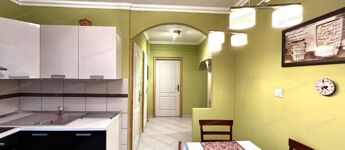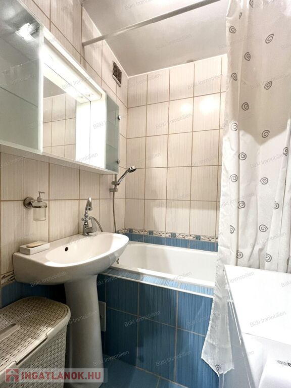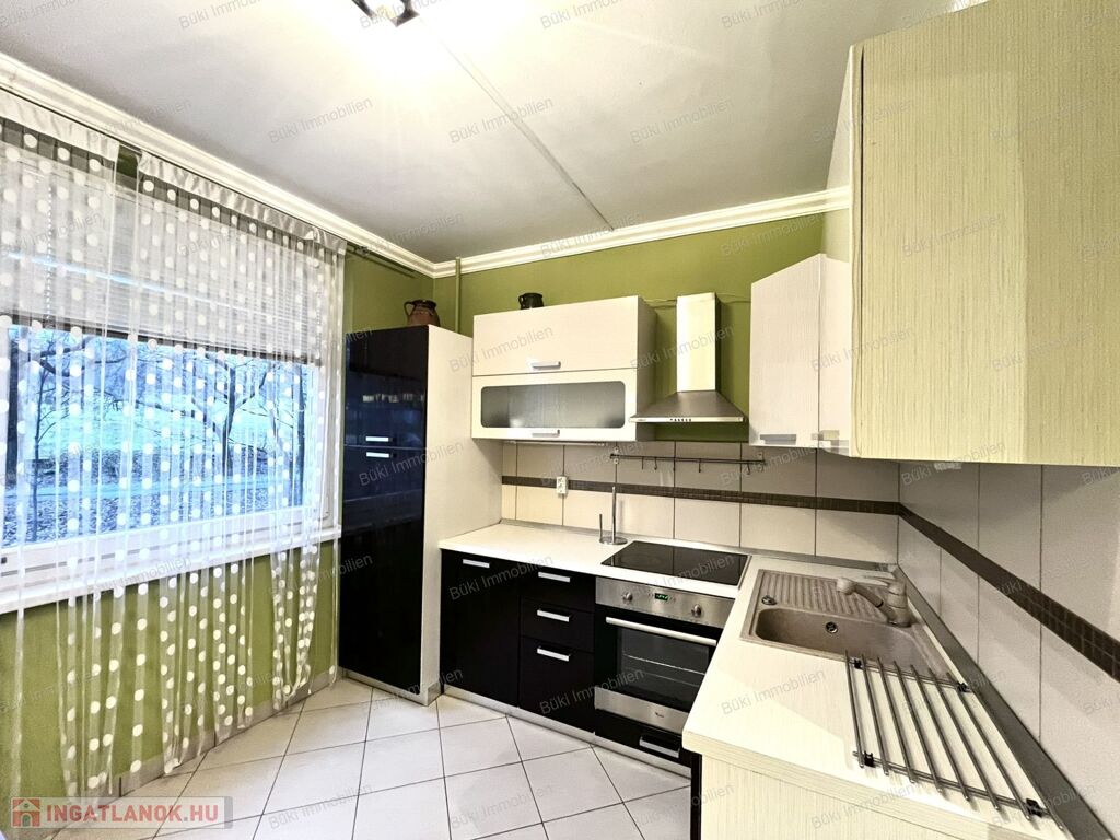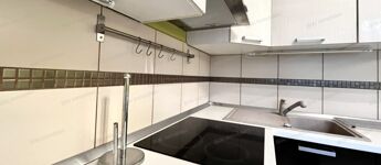 A folyosóról jutunk el a tágas, valóban élhető méretű konyha–étkezőbe, ahol kényelmesen elfér egy nagyobb étkezőasztal is. A modern, magasfényű beépített konyhabútor, a sütő, főzőlap és az elszívó is a kényelmet szolgálja, a helyiség világos és jól szellőztethető. A fürdőszoba praktikus kialakítású, minden kézre áll, a WC külön helyiségben található, ami a mindennapokat még kényelmesebbé teszi.