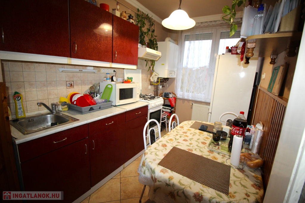 Nyíregyháza-Malomkertben a Kert utcán, 3. emeleten lévő, szigetelt, nagy erkélyes, 58 nm-es, 2 szoba-konyhás, gázfűtéses, tégla építésű lakás eladó.1986-ban téglából épült, külsőleg szigetelt, napfényes keleti fekvésű, klimatizált, 6 nm-es erkéllyel.Műanyag nyílászárókkal, redőnyökkel felszerelt, turbós gáz-cirkós radiátoros fűtési rendszerrel, járólap és parketta burkolattal.Beépített konyhabútorral, felújított fürdőszobával, új biztonsági bejárati ajtóval, saját 6 nm-es pince tárolóval.Közös költség: 6.800,-Ft.Az ingatlan azonosítója: 63693Érdeklődni: +36306982324 Az ingatlan azonosítója: 63693 Érdeklődni: +36306982324