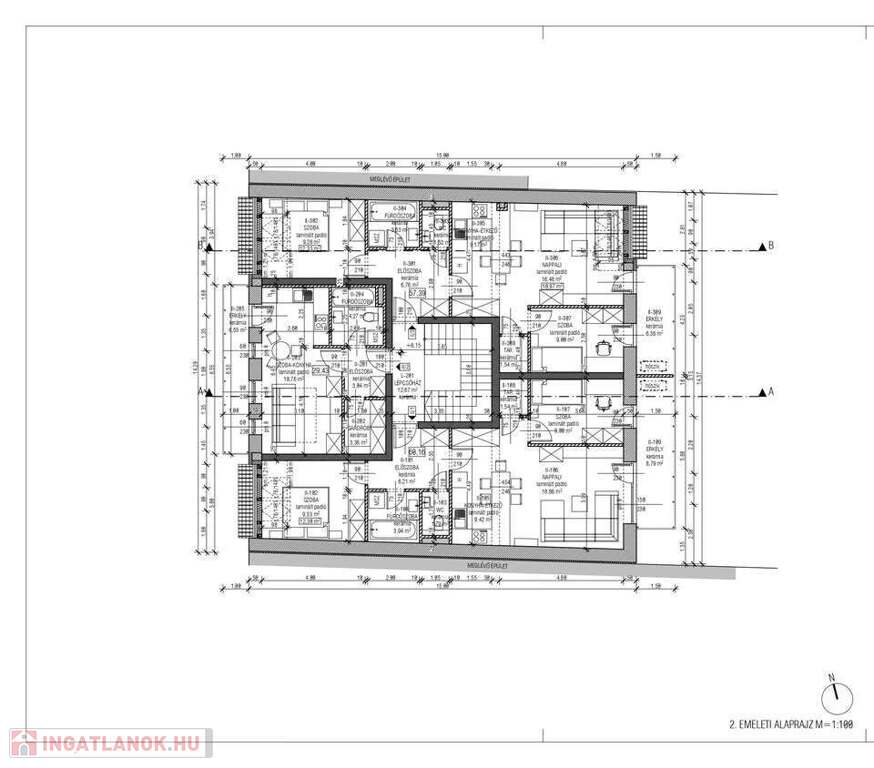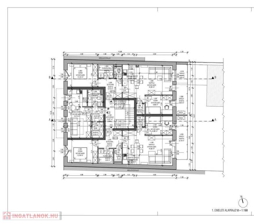 1/3 lakás: 62,91 m2, nappali + 2 szoba, tároló, erkély (6,05 m²), terasz (4,05 m²). Egyedi gázfűtés, padló fűtés. Ára: 68.200.000 Ft